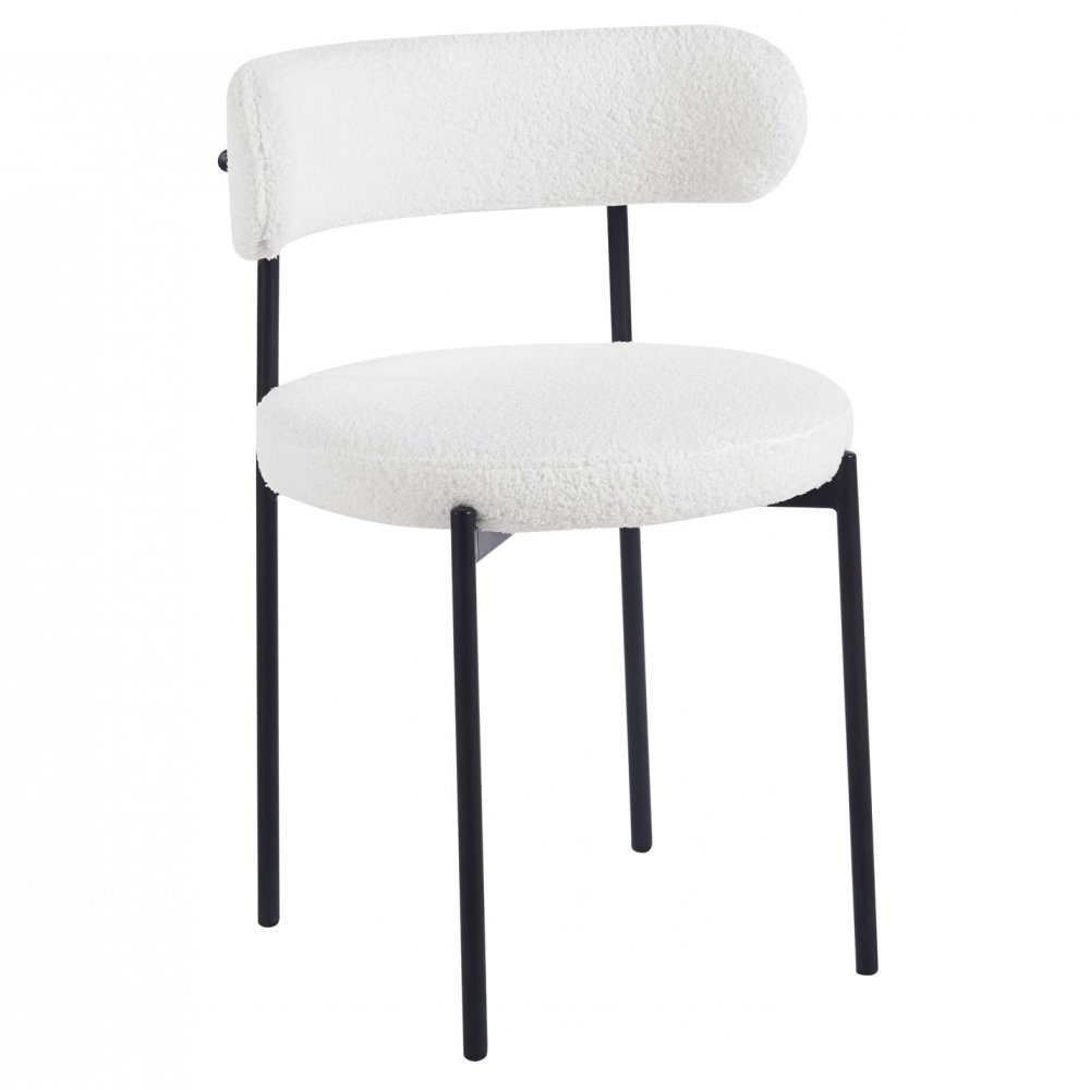 Runt bordet står fyra Wilma matstolar med mjukt stoppad sits och rygg, klädda i vitt trendigt teddytyg. Stolarna har svartlackade metallben som skapar en vacker kontrast mot det ljusa tyget och matchar bordets mörka ton. Kombinationen av det strukturerade tyget och de rena linjerna gör Wilma både bekväm och samtida i sitt uttryck.