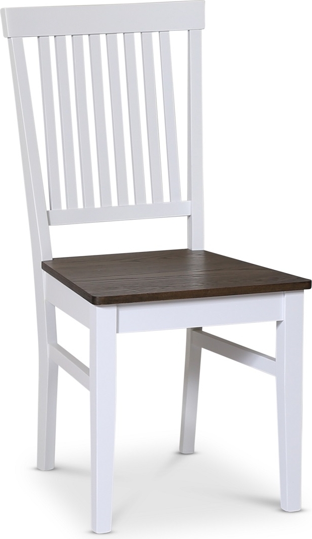 Skagen matgrupp från Skånska Möbelhuset, klassiskt runt matbord Ø120 cm i diameter, med vitt underrede och en toppskiva i brunoljad ekfanèr. Det ingår 4 stycken matchande Skagen stolar i vitlackat trä med en brunoljad eksits.