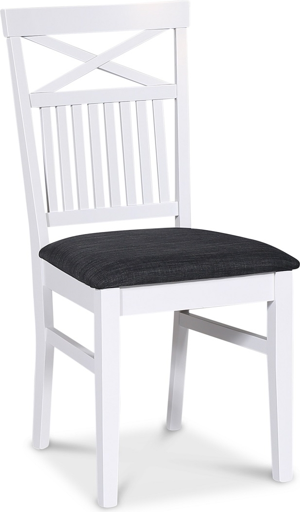 Tromsö matgrupp från Skånska Möbelhuset, klassiskt runt matbord 120 cm i diameter med vitt underrede och en toppskiva i oljad ekfanèr. Det ingår 4 stycken matchande Skagen matstolar i vitlackat trä, kryss i ryggen och sits i grått tyg.